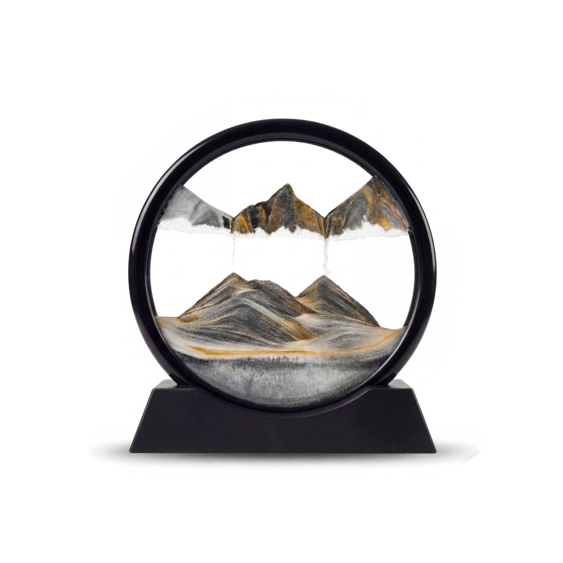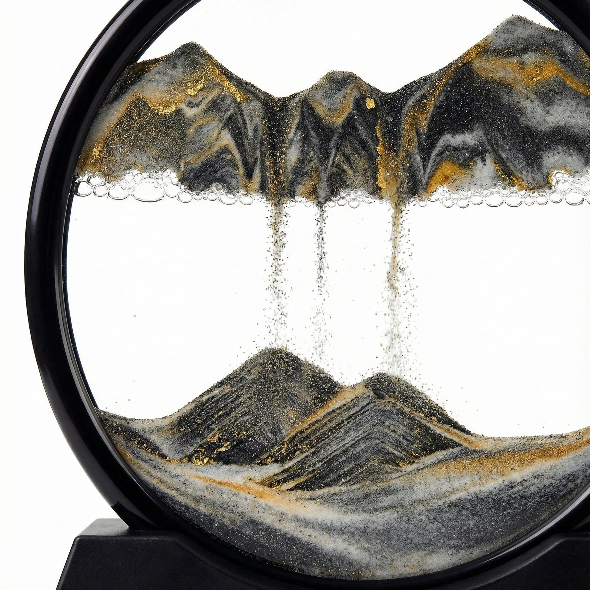 This “Eternal Prelude” Art Hourglass is a signature creation by the SandartFlow team. Its sophisticated black and gold color scheme, composed of primary black, secondary white, and gold accents, conducts a monochrome symphony of light and form. Black sand flows against a pure white expanse, tracing sharp, architectural peaks. Delicate gold sediment captures the light, creating a timeless piece of kinetic art that commands attention in any modern space.