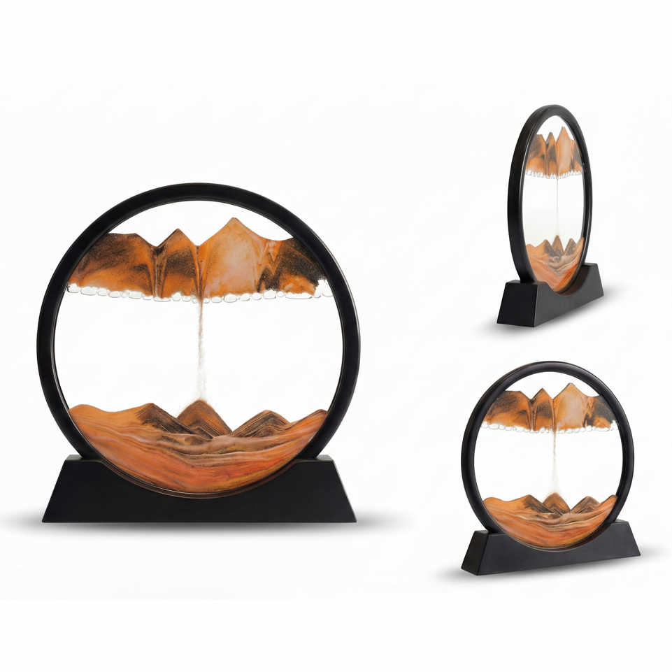 The “Molten Sunset” Art Hourglass is a celebrated piece from SandartFlow. It captures the serene, radiant descent of a desert sun in its distinctive warm orange palette, featuring primary orange, secondary yellow, and white. Gradient sands flow like liquid light, creating a calming and poetic landscape that brings the last warmth of the day into your home.